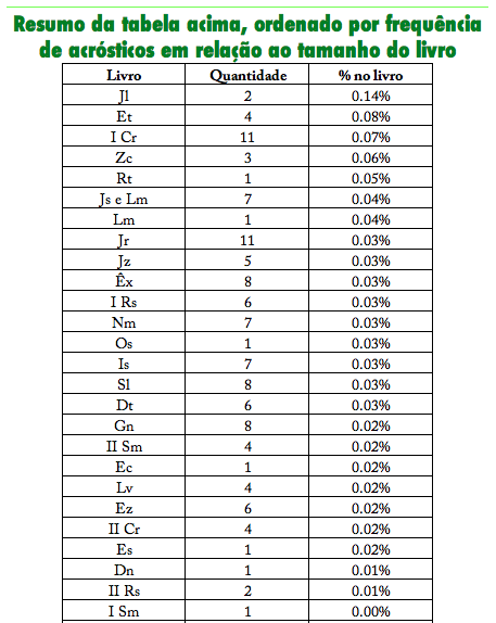 Só consigo pensar em duas explicações para esta diferença: ou a língua hebraica favorece o surgimento de acrósticos aleatórios num grau muito acima do grego, inglês e português (algo difícil de se acreditar e que, até que provem o contrário, inadmissível), ou então estes acrósticos foram colocados ali intencionalmente.